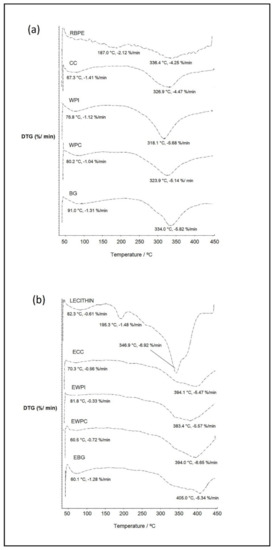 (a) DTG curves of red bell pepper extract (RBPE), calcium caseinate (CC), whey protein isolate (WPI), whey protein concentrate (WPC), bovine gelatin (BG), and (b) DTG curves of soy lecithin (Lecithin) and nanoparticles (EWPI, EWPC, ECC, EBG).