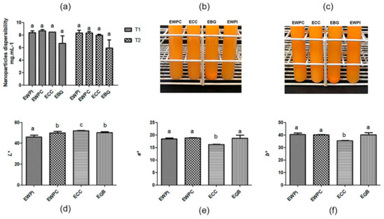 (a) Dispersibility test graph (b) images of powders dispersed in water after 24 h and (c) after 48 h; (d) colorimetric parameter L*, which indicates luminosity (0 = black and 100 = white), (e) colorimetric parameter a*, indicates green (−) to red (+), and (f) colorimetric parameter b* from blue (−) to yellow (+). Values given are averages of three replicates ± standard deviations. Average values with differing superscript letters (between columns of the same proportion group) indicate significantly different values (p < 0.05).
