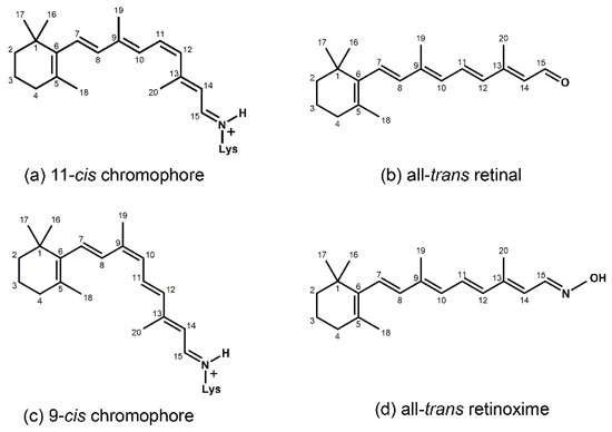 - Verhoeven, M.A.; Bovee-Geurts, P.H.M.; de Groot, H.J.M.; Lugtenburg, J.; DeGrip, W.J. Methyl substituents at the 11- or 12-position of retinal profoundly and differentially affect photochemistry and signalling activity of rhodopsin. J. Mol. Biol. 2006, 363, 98–113. [Google Scholar] [CrossRef]
