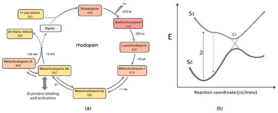 Global presentation of the predominant photochemical pathway in rhodopsin: (a) The 11-cis,15-anti chromophore configuration in rhodopsin is photoisomerized into all-trans. It remains all-trans in all photo-intermediates, except for Meta III, which contains a 15-syn protonated Schiff base [58]. The early photo-intermediates also contain a protonated Schiff base, and relax thermally to deprotonated Meta II states. In many visual pigments, Batho is in equilibrium with a blue-shifted intermediate (BSI) [176,177]. (b) Simplified schematic of a conical intersection where the excited chromophore at the S1 potential energy surface can cross over to the S0 potential energy surface of the photoproduct. The S1 surface can contain thermal transitions, as suggested for isorhodopsin (see text). For rhodopsin, very early interstate mixing between the S1 and S2 states has been proposed, which would lead to excited state population splitting [178].