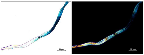 Cotton has a layered structure. Each fibre is created by several dozen (20–30) layers of cellulose coiled and twisted in the shape of a ribbon. The number of turns increases with the degree of cotton ripeness, but when it reaches full maturity, it decreases again and the shape of the fibre is similar to the cylindrical one. The cotton fibre length ranges between 22 and 50 μm, while the average diameter is between 18 and 25 μm. Depending on the fibre type, short, medium- and long-fibre cotton is distinguished [8]. The heterogeneity of the cotton’s surface and structure is clearly visible in polarized light microscopy. Dark bands intersecting the fibres at certain intervals indicate points of reversal of the structure, and thus the location of the coils [7].