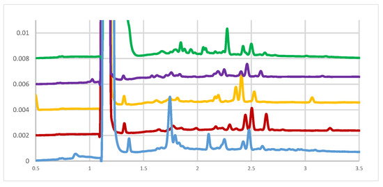 The comparison of electropherograms (PDA at 220 nm) obtained for blue denim fibres from five experimental fabrics. The results obtained for the fibres constituting the individual fabrics are presented in different colors.