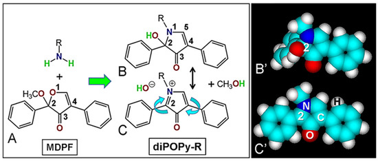 From these early studies and throughout the literature, 2-hydroxy-pyrrolinones have been customarily accepted as the fluorescent products of fluorescamine and MDPF with primary amines. However, for non-planar molecules, such as 2-hydroxy-pyrrolinones, the long absorption (370–380 nm) and emission (480–490 nm) wavelengths they actually show are quite unexpected features [36]. In fact, the occurrence of a tetrahedral C2 atom disrupts the conjugation of the three ring systems, thus avoiding the formation of a coplanar fluorophore, necessary for such long absorption and emission wavelengths. Therefore, the 2-hydroxy-pyrrolinone (Figure 1B,B′) just corresponds to the pseudobase of the true fluorophore, which accordingly is a coplanar, full conjugated and cationic 2,4-diphenyl-3-oxopyrrole (diPOPy, Figure 1C,C′) [37,38,39].