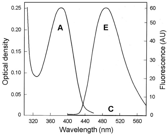 Normalized absorption A and emission E spectra of a 10 µg/mL solution of diPOPy-B in distilled water at pH 7. The line C corresponds to the emission of the reagent MDPF alone in the absence of BA. No emission was found for BA alone. Exciting light: 360 nm.