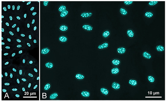 As model microscopic structures, erythrocyte nuclei from chicken blood smears [41,42,43], kinetoplasts from Trypanosoma cruzi (T. cruzi) epimastigotes growing in culture [44,45], and well-orientated 30 nm chromatin fibers from stretched nuclei [46,47] were used by allowing a precise analysis of fluorescence staining reactions of chromatin DNA.