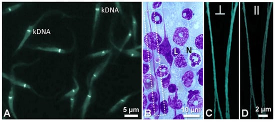 (A) Cultured T. cruzi epimastigotes stained with bis-diPOPy-Sp showing the blue–green fluorescence of kinetoplast DNA (kDNA, bright transverse rod in each cell). (B) Stretched mouse spleen smear after Giemsa staining, showing elongated nuclei containing longitudinally orientated chromatin fibers (dashed rectangle). Observe the typical magenta color of chromatin and the light blue color of basophilic cytoplasm [54]. N: neutrophil; L: lymphocyte. (C,D) Stretched chromatin fibers from a mouse spleen smear stained with diPOPy-B and observed under polarization microscopy, by using perpendicular (C) and parallel (D) positions of the analyzer filter in relation to the axis of the stretched chromatin fibers, showing emission intensity: ⊥ > ∥, which is a typical feature of intercalating agents.