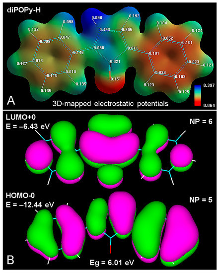Regarding molecular orbitals of diPOPy-H (Figure 7B), energy levels of higher occupied and lower unoccupied molecular orbitals (HOMO-0 and LUMO + 0, respectively) are well separated (LUMO + 0 subtracted from HOMO-0 = Eg = 6.01 eV), which is related to the large Stokes shift and a blue–green emission under UV excitation. As expected, the number of nodal planes is higher for LUMO + 0 than for HOMO-0 [36,40].