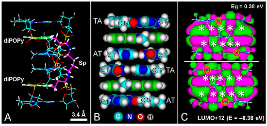 In the case of a hypothetical dye–substrate structure, molecular modeling reveals that adenine–thymine (AT)-containing nucleic acid oligomers such as tetra-(dATAT) can be bis-intercalated by bis-diPOPy-Sp, appearing as the two fluorophore rings separated by ~10.2 Å, in agreement with the “nearest neighbor exclusion principle” for intercalating agents [36,55,56]. Although there is not precise evidence for specific binding to AT base pairs, some presumptive cytological and cytogenetic data support this possibility. Figure 8 shows wire (A) and atomic volume (B) models of the bis-intercalated complex, as well as the overlapping (fused) molecular orbitals (MOs) between each dye and base pairs above and below (C), and the non-overlapping (unfused) MOs between adjacent base pairs, which abolish the in-phase π-electron conjugated stacking in these sites.