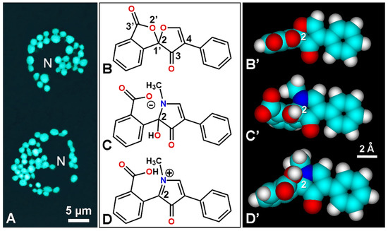 (A) Fluorescence micrograph of horse eosinophil leucocytes after staining with fluorescamine. Note the bright blue–green emission of eosinophilic granules in the cytoplasm. N: bilobed nuclei (dark volume). Fluorescence registered under UV exciting light. (B–D) Chemical structure and numbered positions of the fluorescamine lactone (B), the pseudobase of the reaction product with methyl-amine at alkaline pH (C), and the cationic product at strong acid pH with unionized carboxyl group (D). (B′–D′) Corresponding atomic volume models after PM3 converged at E = 0.1 kcal/(Å mol), showing the almost orthogonal geometry of the benzoic acid ring relative to the other two rings. Element colors as in Figure 1.