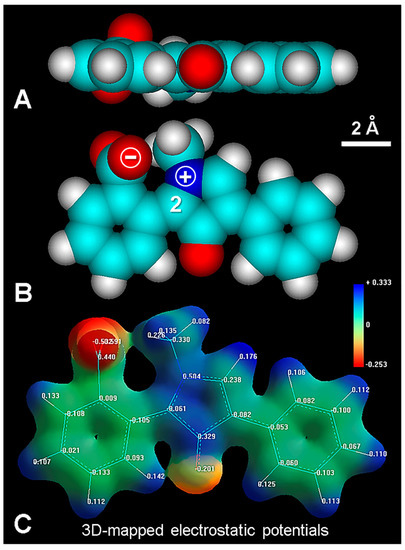 (A,B) Molecular modeling of the possible reaction product between fluorescamine and methyl-amine at neutral pH, showing the planar structure in lateral and frontal atomic volume views, respectively. Negative and positive signs correspond to the formal positive and negative charges of the tentative inner-salt (zwitterion) form of the planar BzPOPy fluorophore from fluorescamine. The trigonal C2 atom is indicated. Element colors as in Figure 9. (C) The same molecule showing partial charges (eV), and 3D plotting of electrostatic potentials (from negative to positive values: red → green → blue), using the translucent isosurface rendering (total charge density contour value: 0.03), after energy minimization with HyperChem v8.0.10 and PM3 converged at E = 0.5 kcal/(Å mol). Partial charges for the N and O atoms from the inner salt are + 0.504 and −0.591 eV, respectively.