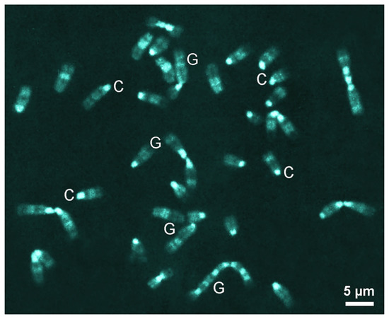 Metaphase chromosomes from a cultured mouse L-929 cell stained with fluorescamine, washed in tap water and mounted in a McIlvaine buffer (pH 7) glycerol–MgCl2 mounting mixture, showing the strongly fluorescent C-bands (AT-rich pericentromeric heterochromatin (C)), and also considerable emission of Q/G-bands (G) (adapted with permission from Ref. [28] 2012, Copyright Clearance Center, Marketplace Chicago, IL 60673-1291).