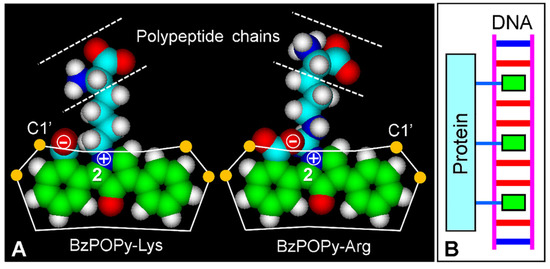 As the fluorescamine reactions that reveals protein amino groups from arginine and lysine residues near to the negatively charged floor of the DNA minor groove [104] colocalize with AT-rich chromosome regions, it is tempting to speculate that DNA intercalation of BzPOPy takes place precisely within these regions. The observed more intense fluorescence can be due to the rigid intercalative binding of the planar inner-salt fluorophore. As the phenyl and benzoic rings of BzPOPy can rotate lightly, a close fitting of the high propeller-twisted (dA)n • (dT)n regions [105] with the intercalated fluorophore would occur. The flexible bridge of five and six atoms (lysine and arginine, respectively) between the fluorophore and the polypeptide chain could also provide the approach needed for suitable DNA intercalation (Figure 12A). A schematic representation of the proposed intercalation of BzPOPy-Lys and BzPOPy-Arg from labeled proteins into DNA containing dA6dT6 sequences is shown in Figure 12B.