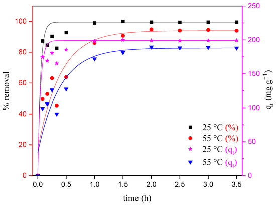 The equilibrium adsorption capacity was clearly affected by the temperature (Figure 5). The adsorption of MO decreased from 197.3 mg g−1 (99.5% removal) to 185.8 mg g−1 (94.5% removal) when the temperature was raised from 25 to 55 °C. The decrease in MO removal for the highest temperature indicates not only that the temperature has a significant effect on adsorption, but also that the adsorption of MO onto the ZHN adsorbent surface is kinetically controlled via an exothermic process [29,32,33]. Therefore, the dominant mechanism expected is mainly physical, since, at the highest temperature, the desorption of dye molecules instead of adsorption occurs on the active sites of the adsorbent surface [29,30,31,34].