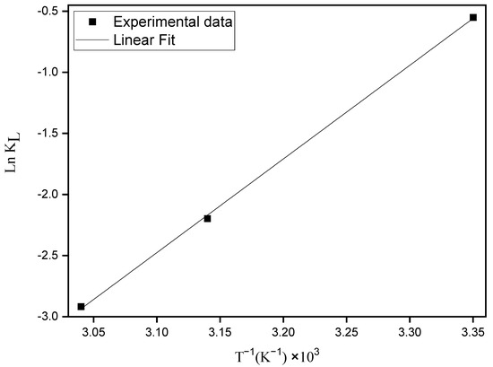 where R is the gas constant (R = 8.314 J mol−1 K−1); T the absolute temperature; KL is the equilibrium Langmuir constant (L mg−1). Equation (6) provides the enthalpy and entropy changes by plotting ln KL versus T−1 (Figure 6).