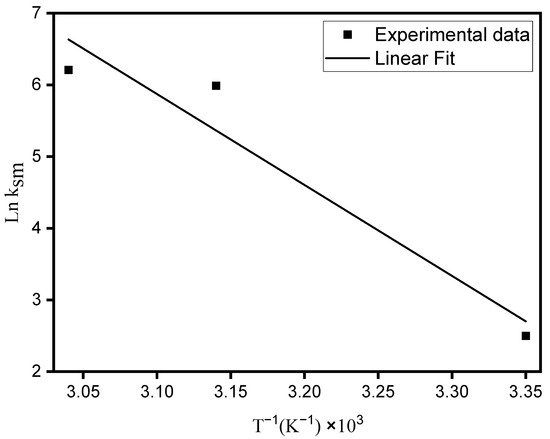 The activation energy was obtained through the graph of ln ksm versus T−1 (Figure 7) according to Equation (9). The value obtained was 105.45 kJ mol−1, which characterizes a chemisorption process, since values between 5–40 kJ mol−1 are characteristic of physical sorption, while values between 40–800 kJ mol−1 refer to chemisorption [45,46].