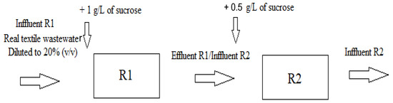 Two glass bottle reactors with a capacity of 5 L and working volumes of 4 L (R1) and 3.6 L (R2) were sealed with a plastic cover and used in the experiments (Figure 1). The first reactor was fed with real effluent diluted to 20% (v/v)—20 mL of effluent to 80 mL of tap water, sucrose (1 g/L) as a co-substrate, and streptomycin antibiotic (0.1 g/L) to minimize medium contamination by opportunistic bacteria. After 48 h of reaction, the effluent of R1 was introduced into the second reactor, 0.5 g/L sucrose was added, and the reaction time set was to 48 h.
