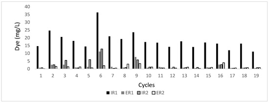 Dye concentration in influent (IR) and effluent (ER) of R1 and R2 reactors over the course of operating cycles.
