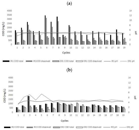 Variations in COD and pH in the influent and effluent of reactors R1 (a) and R2 (b).