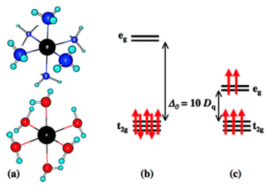 When ligands bind to the metal center, they create an electric field around the metal ion, deemed the ligand field, which arises from the distribution of electron density in the metal–ligand bonds [6,42]. The strength of the ligand field, influenced by the ligands’ nature (strong field or weak field) [17], determines the intensity of the metal’s d-orbital splitting and/or degree of charge transfer [20,43,44]. In terms of d-orbital splitting, the energy difference between the eg orbitals and the t2g orbitals (octahedral) suggests the relative strength of orbital splitting affected by ligand fields [16]. Such magnitudes of energy may lie in the visible light range, with wavelengths complementary to the color reflected; therefore, ligand fluctuation manifests in color changes.