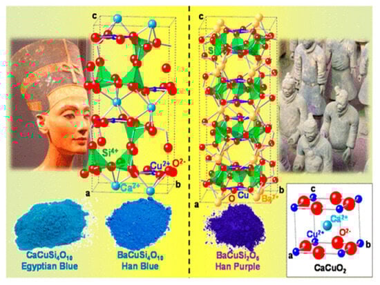 - Nicola, M.; Gobetto, R.; Masic, A. Egyptian Blue, Chinese Blue, and Related Two-Dimensional Silicates: From Antiquity to Future Technologies. Part A: General Properties and Historical Uses. Rend. Lincei. Sci. Fis. E Nat. 2023, 34, 369–413. [Google Scholar] [CrossRef]