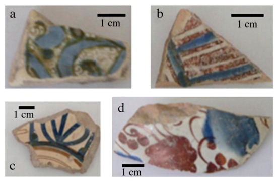 (a) Sample GMS1, fragment of vase in Malaga style, century 1330–1370. (b) Sample C124, fragment of bowl in Pula style with radial metopes, century 1380–1410. (c) Sample GMS6, fragment of bowl of the crown series, century 1410–1425. (d) Sample GMS9, fragment of “ivy leaf” vase, century 1450–1480 Reproduced with permission from [31]. Elsevier, 2008.