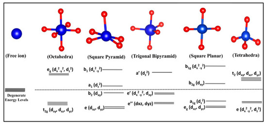 The quantity of d-electrons and the nature, number, and geometric configuration of the ligands encircling the metal ion influence the magnitude of the energy gaps between their orbitals [19]. Upon ligands binding to the metal, the behavior of the two axial d-orbitals, dx2−y2 and dz2, diverges from that of the three non-axial orbitals, dyz, dxy, and dxz, in an octahedral complex [35]. Orbital orientations allowing overlapping with ligands’ bonding orbitals are energetically shifted relative to the non-bonding d-orbitals due to electrostatic repulsions of their like negative charges [7,35]. Consequently, this leads to an energy disparity between the previously degenerate orbitals. Different complex geometries exhibit characteristic magnitudes of energy discrepancies in their metallic or molecular orbitals due to the variability of the orientation of ligands and coordination number [36] (Figure 6).