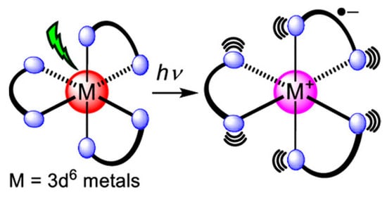 - Sinha, N.; Wenger, O.S. Photoactive Metal-To-Ligand Charge Transfer Excited States in 3d6 Complexes with Cr0, MnI, FeII, and CoIII. J. Am. Chem. Soc. 2023, 145, 4903–4920. [Google Scholar] [CrossRef]