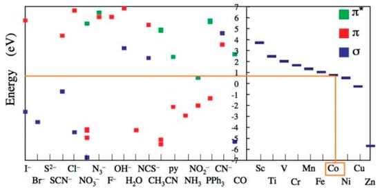 Two-dimensional spectrochemical series demonstrating relative ligand field splitting of metal ions and ligand combinations using the relative energies of the 3d orbitals of the metallic centers and molecular orbitals of the ligands. Reproduced with permission from [16]. Royal Society of Chemistry, 2003.