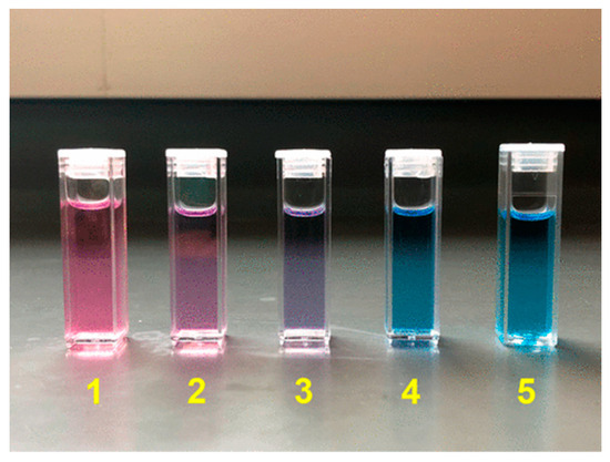 Solutions in order of decreasing concentrations of alcohol-based octahedral Co complex (pink, labeled as 1) as increasing the concentration of propanol, shifting the chemical equilibrium toward producing more tetrahedral Co complex (blue, labeled as 5). Reproduced with permission from [9]. American Chemical Society, 2020.