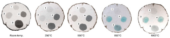 Depicts a sequence of images showing a glazed bisque disk at various stages: prior to firing, and then post-firing at 250 °C, 550 °C, 850 °C, and 1000 °C. The dots of glaze on the disk are marked as follows: (1) without any colorant, (2) containing 1% malachite, (3) with a mix of 1% CuO and 1% SiC, and (4) with 1% CuO alone. Reproduced with permission from [19]. MDPI, 2022.