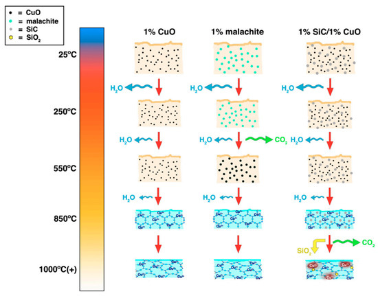 Proposed mechanisms and timelines of the firing process for the “Robin’s egg blue” glaze variations, based on spectroscopy measurements, are illustrated in Figure 12 [19]. At room temperature, CuO and malachite, represented by black and turquoise dots, respectively, exist as a physical mixture with other raw glaze materials (tan). As the kiln temperature rises, free water particles and lattice-bound water evaporate, as depicted by the blue arrows. For the 1% malachite glaze, by 550 °C, malachite (turquoise dots) decomposes to CuO (black dots), producing CO2 as a byproduct (green arrow). By 850 °C, the presence of color due to Cu2+ coordination suggests the presence of a silica–alumina matrix (represented by the regularly ordered lattice structure), which becomes more disordered as the glaze transforms into glass while maintaining the same local structure with the same coordination around the Cu2+ center ions. In the case of the 1% SiC/1% CuO glaze, SiC (gray dots) remains unreacted until temperatures exceed 1000 °C, when it reacts with CO2 to reduce Cu2+ to Cu+, generating SiO2 as a byproduct (yellow dots). This study [19] underscores the significance of employing a bottom-up approach to investigate the molecular mechanisms underlying coloring in ceramics or other pigment production.