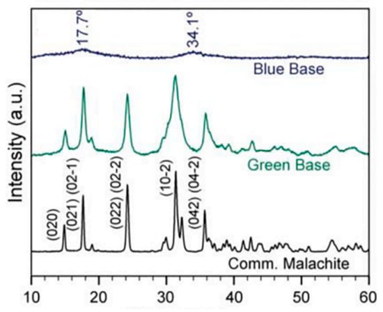 Comparison of XRD spectra for the synthesized blue base pigment (shown in blue) and green base pigment (displayed in green) against that of commercial malachite (represented in black). Reproduced with permission from [13]. Elsevier, 2022.