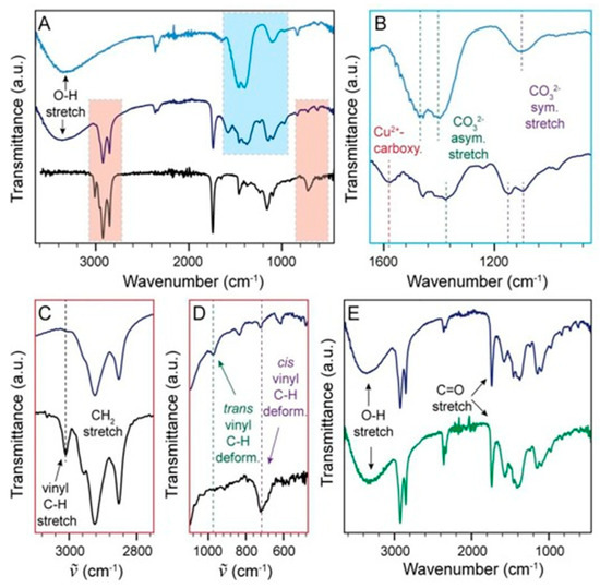 Hills-Kimball et al. [13] employed Fourier-transform infrared (FTIR) spectroscopy to identify the alteration of bound ligands that are responsible for the color change in copper-based colorants after curing in linseed oil-based paint. Specifically, the carbonate asymmetric stretching peaks shifted, and symmetric stretching peaks were split into two peaks (Figure 15A,B), indicating a change in the short-range order of the georgite pigment upon incorporation into the paint. An additional Cu2+–carboxylate peak also emerged at ~1575 cm−1 due to pigment interactions with the linseed oil binder. Surprisingly, the FTIR spectrum for the malachite linseed oil-based paint matched the spectrum of the georgite linseed oil-based paint (Figure 15E), indicating similar short-range order for both pigments following paint curing, which is most likely responsible for the similar final green color of the two paints. Since both pigments possessed the Cu2+–carboxylate vibrational peak, it is evident that carboxylate acid moiety byproducts of the linseed oil autoxidation reaction are able to disrupt Cu2+–carbonate interactions in both pigments, forming Cu2+–carboxylate complexes. This study demonstrated that FTIR spectroscopy is highly sensitive to any changes in the local ligand environment surrounding the transition metal ions in complexes.