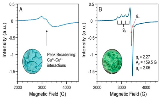 (A) EPR spectrum of pure georgite with broadened peaks. (B) EPR spectrum of the georgite paint after curing. Insets feature images of both georgite and its paint counterpart. Reproduced with permission from [13]. Elsevier, 2022.