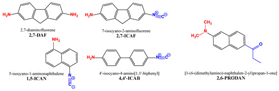 The isocyano-aminoarene-type push–pull fluorophores (2,7-ICAF, 1,5-ICAN and 4-4′-ICAB), the starting material (2,7-DAF) and a commercially available dye (2,6-PRODAN) for comparison.