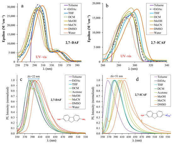For UV–vis and fluorescence measurements, the investigated compounds were dissolved in acetonitrile at a concentration of 0.6 mg/mL and were diluted to 7.40 × 10−6 M (2,7-DAF) or 4.84 × 10−6 M (2,7-ICAF) in the solvents of interest.
