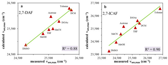 One of the most recent methods to quantify the solvatochromic behaviors of 2,7-DAF and 2,7-ICAF is the Catalán scale [32]. This multiple linear regression (MLR) analysis-based procedure can account for the specific solvent–dye interactions. The effect of these specific interactions on spectral parameters, such as emission maxima or Stokes shifts (ΔνSS), is determined using Equation (1):