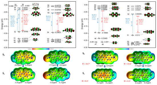 Calculated molecular orbitals (MO, above) and electrostatic potential surface ground states (S0) and excited states (S1) (ESP, below) of 2,7-DAF and 2,7-ICAF (left) as well as 4,4′-DAB and 4,4′-ICAB (right), together with the calculated spectroscopical data and the dihedral angles of 4,4′-DAB and 4,4′-ICAB. The black italic numbers are the calculated NICS values for the corresponding aromatic rings.