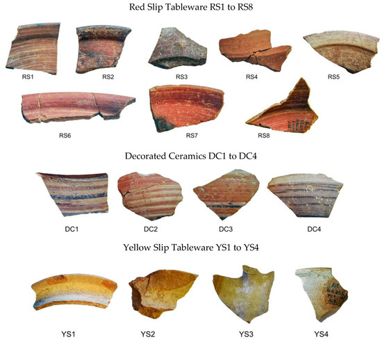 These first observations led us to the identification of eight MGs for red slip ware, four MGs for painted pottery, four MGs for yellow slip pottery, six MGs for grey ware, four MGs, five MGs for common ware, and for handmade pottery. From these groups, specific samples from different contexts were chosen for the current analysis. Additionally, samples of coating techniques, specifically red slip and yellow slip engobe surfaces, were also subjected to archaeometric analysis.
