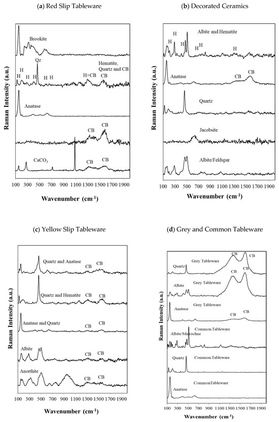 Micro-Raman spectroscopy is an excellent technique to identify the compounds used to decorate the surface of the ceramic or the engobes. In the case of the red slip tableware, the red colour is due to the use of hematite (H, α-Fe2O3) associated with brookite (TiO2). All the red slip ware ceramics were made with Pliocene clays, highly siliceous, so the detection of quartz in all samples is no surprise. Also, the red engobe exhibits anatase (TiO2) and carbon black in the darker surfaces. In some special cases, a remarkable amount of calcium carbonate was detected, as shown in Figure 2 and also in the fifth curve of Figure 4a).