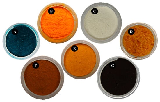 - Hernández, M.; Felipe, C.; Guzmán-Vargas, A.; Rivera, J.L.; Lima, E. Highly Stable Hybrid Pigments Prepared from Organic Chromophores and Fluorinated Hydrotalcites. Colorants 2024, 3, 125–135. [Google Scholar] [CrossRef]