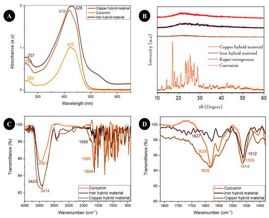 Figure 2A shows the UV–Vis spectrum of curcumin and the Cu and Fe hybrid materials. The curcumin exhibited maximum absorption at the wavelength of 425 nm and weak absorption at 262 nm [38]. The samples containing Cu and Fe exhibited more intense absorption bands, with a shift of approximately 6 nm [39]. Furthermore, bands at 419 nm and 255 nm were clearly observed for the Cu hybrid material, while peaks at 428 nm and 257 nm are observed for the Fe hybrid material. The crystal structure of samples was further investigated through XRD, and the results are presented in Figure 2B. The XRD of curcumin exhibits its typical crystal structure with intense peaks, especially at angles below 30 degrees, similar to what has been reported in other similar studies [40]. For the Kappa-carrageenan samples, an amorphous structure was observed, similar to that reported by other authors [41]. The amorphous behavior remained predominant for the hybrid samples, where no peaks corresponding to the crystal planes could be identified. The FT-IR was used to identify the functional groups on the surface of the samples, and the results are displayed in Figure 2C,D. The infrared spectra of curcumin show a typical band at 3461 cm−1 corresponding to phenolic stretching (O-H). Thus, aromatic stretching (C=C) and stretching vibrations (C=C) were observed at 1629 cm−1 and 1509 cm−1, respectively. Stretching vibrations (C=O) were observed at 1599 cm−1, and bending vibrations (C-H) and aromatic stretching (C-O) vibrations were noticed at 1427 cm−1 and 1280 cm−1, respectively. Finally, stretching vibrations (C-O-C) were observed at 1025 cm−1 [42]. The FT-IR of the Fe and Cu hybrid materials exhibit similar bands to those observed in curcumin. Furthermore, the vibration modes underwent shifts in their wavenumber, indicating changes in the vibrational state of curcumin upon binding to the metal ions [43,44].