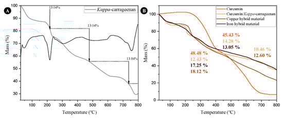 TGA was performed on the hybrid materials, curcumin, and Kappa-carrageenan, and the results are shown in Figure 3. Kappa-carrageenan (Figure 3A) exhibited three stages of weight loss, which is consistent with previous reports [45]. The first thermal event occurred around 218 °C. The second and third thermal event occurred at approximately 531 °C and 747 °C, respectively. The decomposition of curcumin began around 333 °C, with total degradation occurring around 575 °C, reaching 45.43%, which is in accordance with the literature reports. The TGA curve for Curcumin/Kappa-carrageenan (Figure 3B) shows three stages of mass losses of 12.43%, 14.29%, and 10.46% at temperatures of 207 °C, 342 °C, and 722 °C, respectively. Finally, two and three stages of mass loss were observed for the iron and copper hybrid materials, respectively. Both samples exhibited the greatest mass loss in the first thermal event, 17.25% and 18.12%, at temperatures of 198 °C and 229 °C, respectively [33].