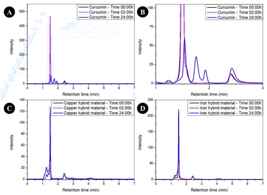 (A) Chromatogram of the analyzed curcumin solution at different time intervals; (B) enlargement of the curcumin chromatogram at the 24:00 h time point; (C) chromatogram of the analyzed copper hybrid material solution at different time intervals; (D) chromatogram of the analyzed iron hybrid material solution at different time intervals.