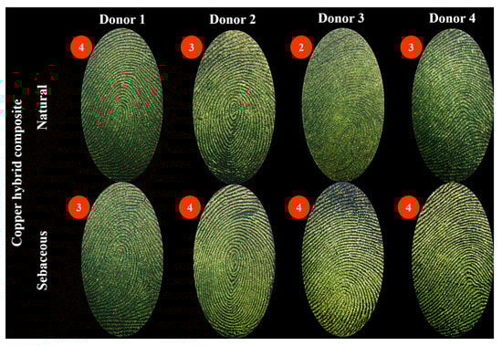 The evaluation of latent, natural, and sebaceous fingerprints from four donors, developed with copper and iron hybrid composites, was carried out according to the scale proposed by Sears et al. (2012) [37] (Table S1—Supplementary Information). This assessment was conducted by five independent analysts, all of whom hold Bachelor’s degrees in Forensic Chemistry from the Federal University of Pelotas. To determine the final score, located to the left of the respective image in each corresponding figure, the most frequently assigned evaluation among the five analysts was chosen.