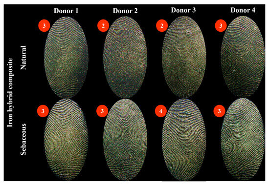Natural and sebaceous fingerprints developed with the Fe hybrid composite and their respective scores.