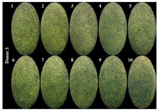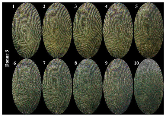 To evaluate the sensitivity of the composites in developing fingerprints, depletion series were performed. These series consist of successive contacts of the same finger with the surface, resulting in a progressive reduction in the amount of residue left with each new contact. Thus, the effective development of fingerprints left in the final contact indicates higher sensitivity in the developing powder, as there is less material available for adhesion [37]. Figure 7 and Figure 8 present the depletion series for donor 3, developed with Cu and Fe composites, respectively. Although the Cu composite showed better performance with the previously discussed fingerprints, when comparing the depletion series for donor 3, greater clarity was observed in the revelations made with the Fe composite. This composite demonstrated good development, with excellent sharpness and contrast in most deposits, except for the tenth, where there was a significant decrease in quality. On the other hand, the Cu composite showed better clarity in the first four deposits, but from the fifth onward, there was a progressive decline in the quality of development. This decline may be attributed to the higher contrast provided by the Cu composite, which could have hindered the clarity of the fingerprints in deposits with less sebaceous residue. Similar results were observed for the other donors in the depletion series, as shown in Supplementary Figures S2–S7. Although the Fe composite offers lower contrast compared to Cu, it demonstrated superior sharpness in the depletion series for all donors, often effectively revealing fingerprints up to the tenth deposit. In contrast, the Cu composite showed satisfactory development, with good results up to the fourth deposit, followed by a progressive decline in quality from the fifth onward.
