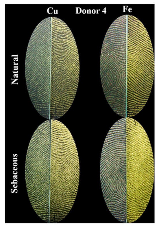 It is important to consider that fingerprints exhibit inherent variability in their composition, including factors such as chemical composition, the amount of material deposited, and the pressure applied during deposition. To minimize the impact of these variables on fingerprint development, the use of half-and-half fingerprint tests is an effective approach. In this method, fingerprints are deposited and physically split along the centerline, allowing each half to be developed using different techniques or powders (powdering method) [37]. This “half-and-half” strategy, applied to the comparative analysis between synthesized powders and commercially available powders, is particularly relevant as it allows the evaluation of whether the developed material performs similarly to those currently used by the Federal Police [32]. Figure 9 illustrates the natural and sebaceous fingerprints of donor 4, developed using the half-and-half method. The left halves were developed with Cu or Fe composites, while the right halves were developed with the commercial Gold® powder. Good development of natural fingerprints was observed with both composites, exhibiting a quality comparable to that of the commercial Gold® powder. In the case of sebaceous fingerprints, the Cu composite showed a performance similar to that of the commercial powder, while the Fe composite demonstrated superior sharpness compared to the commercial powder. Figures S8 and S9 (Supplementary Information) show the half-and-half fingerprints of the other donors. A similar behavior was observed in the development of the composites, with a performance equivalent to, or better than, that of the commercial powder. When comparing both composites, the Fe one stood out by providing greater sharpness, resulting in clearer definition of the fingerprint minutiae; this may be related to the weak magnetic cohesion that can favor the uniform distribution of particles in certain contexts, such as when applied to irregular surfaces. In the case of iron (Fe) composites, this property allows the material to be easily dispersed and adhere to other surfaces, which can result in greater-definition details when applied as a fingerprint developer. In contrast, materials with stronger magnetic cohesive forces tend to form agglomerates and may have a lower capacity for adhesion and homogeneous distribution [55,56].
