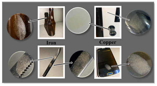 So far, hybrid material composites have been evaluated as developers for latent fingerprints using various methods, all applied to glass surfaces. Considering that the surface on which a fingerprint is deposited can significantly influence the effectiveness of its development, the final analysis of these powders included tests on surfaces representative of those encountered in operational work. For this, the same composites were applied to different surfaces commonly found in forensic investigations [37]. Examples of these surfaces can be seen in Figure 11.