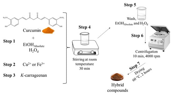 The hybrid materials were synthesized following a one-pot methodology adapted from Li et al. (2021) [33]. Briefly, in a beaker, we added copper acetate monohydrate (Cu(CO2CH3)2·H2O, Vetec-P.A) (0.1359 g, 0.0012 mmol) or iron (III) chloride hexahydrate (FeCl3·6H2O, Vetec-P.A) (0.1834 g, 0.0008 mmol) into curcumin (0.5000 g, 0.0014 mmol) previously dissolved in a solution of ethanol (8 mL) and deionized water (4 mL). Then, Kappa-carrageenan (1.0000 g, 0.0023 mmol) was added to the mixture in the beaker, which reacted for 30 min at room temperature. The mixture was rinsed with deionized water (200 mL) and absolute ethanol (200 mL). Finally, the material was centrifuged (10 min, 4000 rpm) to separate the solid–liquid phases. The solid fraction was dried in an oven at 60 °C for 2 h. Scheme 1 presents the synthesis of new hybrid materials.